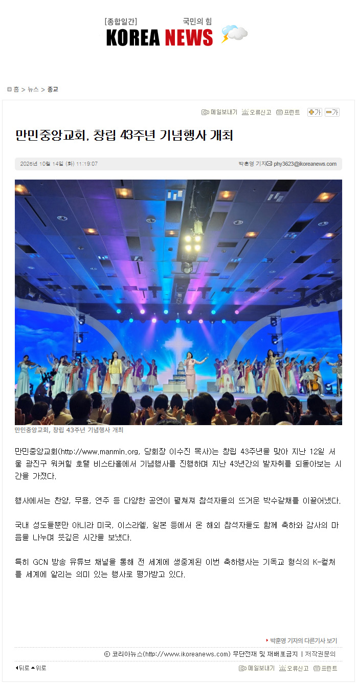 [K°æÂûÀϺ¸]¸¸¹ÎÁß¾Ó±³È¸(´çȸÀå À̼öÁø ¸ñ»ç), ⸳ 43Áֳ⠱â³äÇà»ç '±âµ¶±³ K-ÄÃó Àü¼¼°è¿¡ ¾Ë·Á' "½Å¾Ó°ú