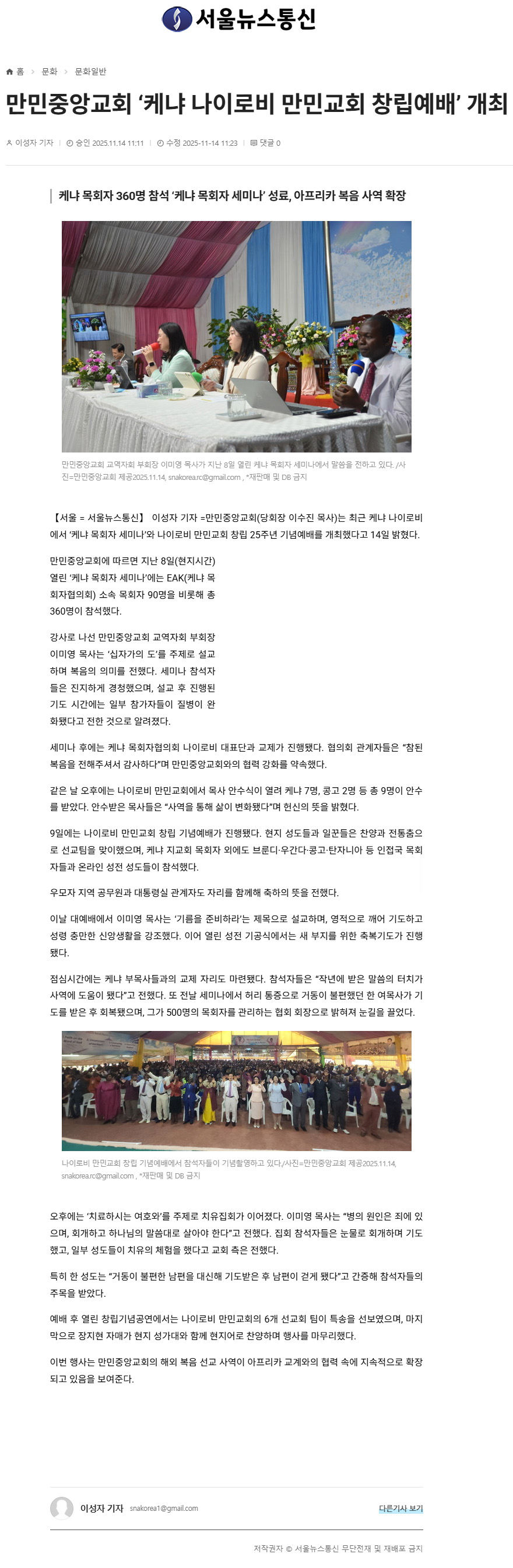 ¸¸¹ÎÁß¾Ó±³È¸(´çȸÀå À̼öÁø ¸ñ»ç)´Â ÃÖ±Ù ÄÉ³Ä ³ªÀ̷κñ¿¡¼ 'ÄÉ³Ä ¸ñȸÀÚ ¼¼¹Ì³ª'¿Í ³ªÀ̷κñ ¸¸¹Î±³È¸ ⸳ 25Áֳ⠱â³ä¿¹¹è¸¦ °³ÃÖÇß´Ù°í 14ÀÏ ¹àÇû´Ù. ¸¸¹ÎÁß¾Ó±³È¸¿¡ µû¸£¸é Áö³ 8ÀÏ(ÇöÁö½Ã°£)¿¸° 'ÄÉ³Ä ¸ñȸÀÚ ¼¼¹Ì³ª'¿¡´Â EAK(ÄÉ³Ä ¸ñȸÀÚÇùÀÇȸ) ¼Ò¼Ó ¸ñȸÀÚ 90¸íÀ» ºñ·ÔÇØ ÃÑ 360¸íÀÌ Âü¼®Çß´Ù. ...