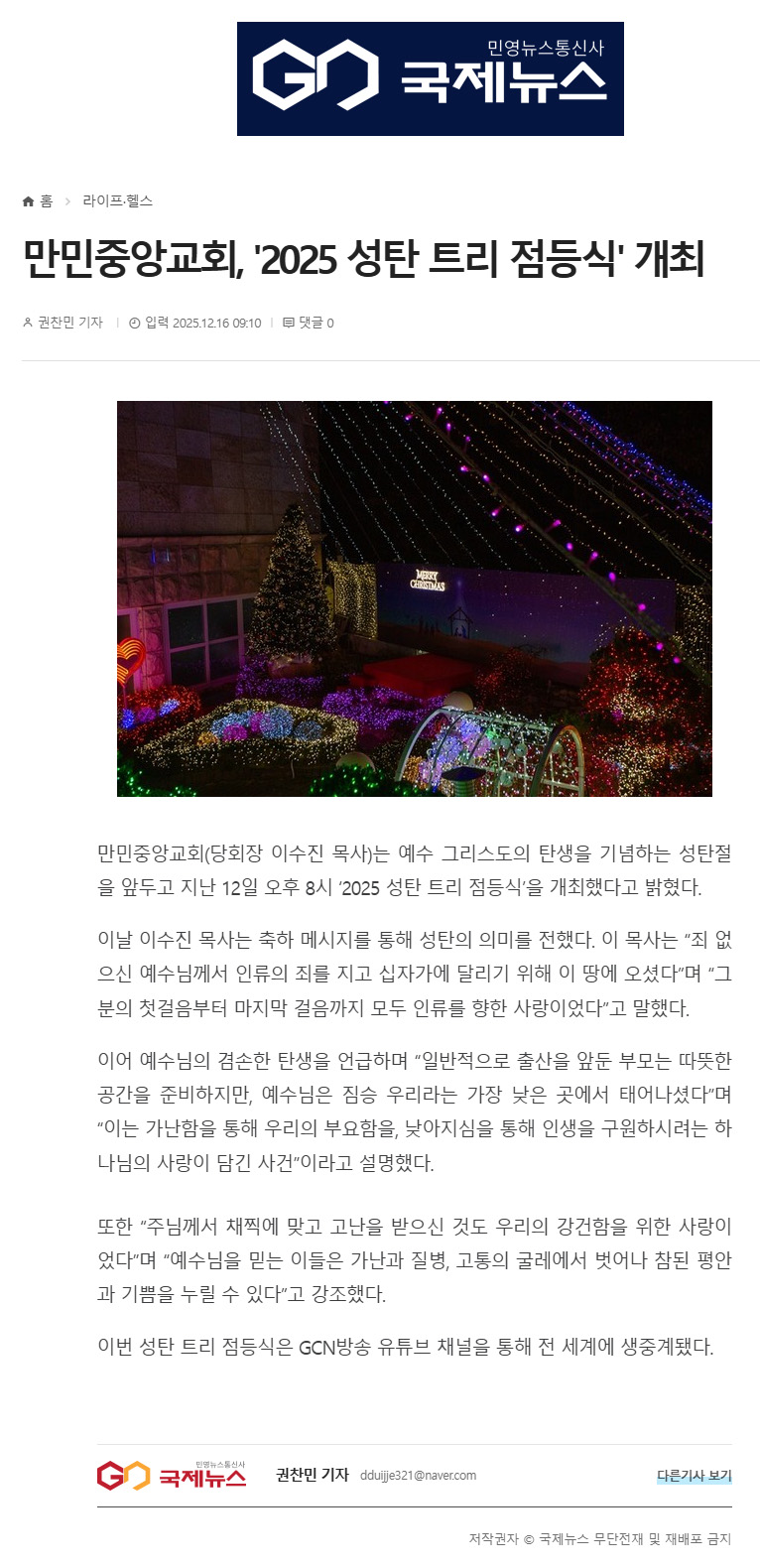 ¸¸¹ÎÁß¾Ó±³È¸, '2025 ¼ºÅº Æ®¸® Á¡µî½Ä' °³ÃÖ