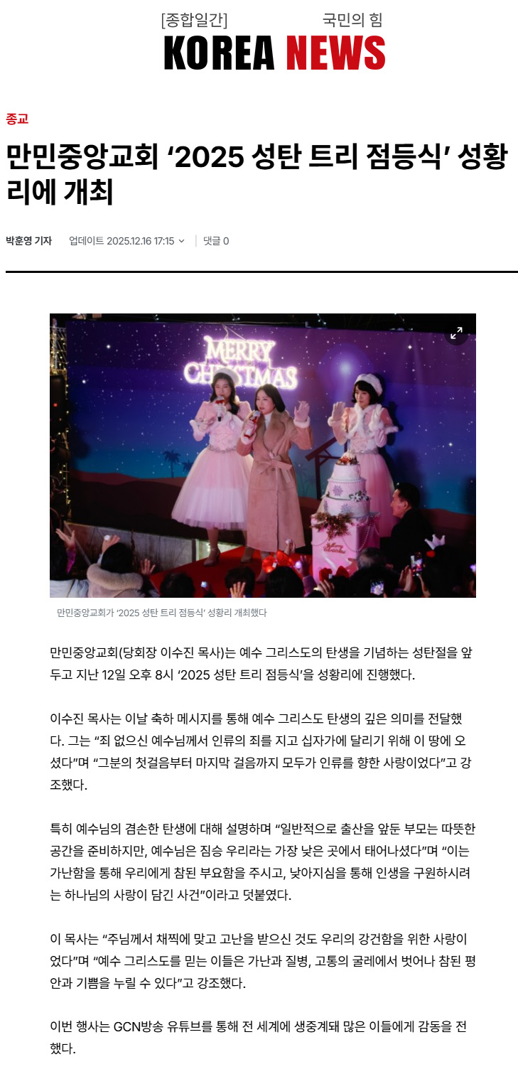 ¸¸¹ÎÁß¾Ó±³È¸ '2025 ¼ºÅº Æ®¸® Á¡µî½Ä' ¼ºÈ²¸®¿¡ °³ÃÖ