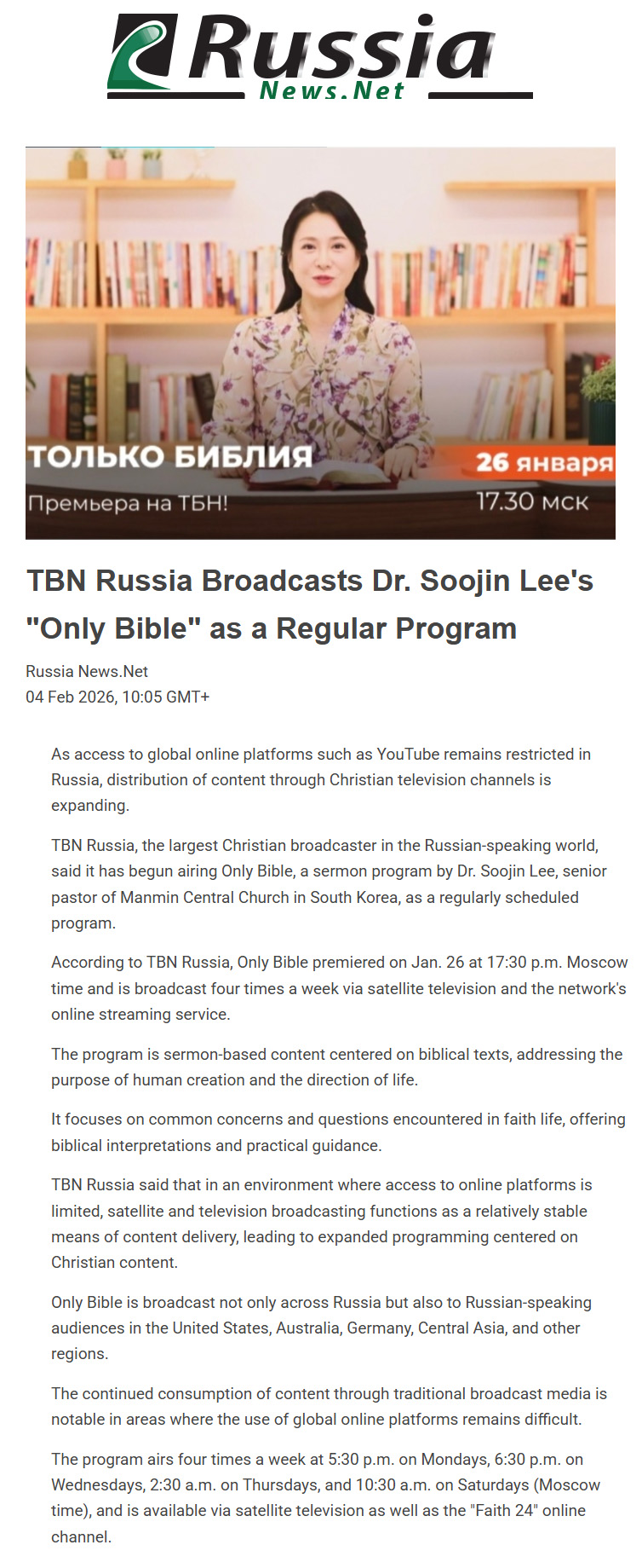 TBN Russia Broadcasts Dr. Soojin Lee's "Only Bible" as a Regular Program