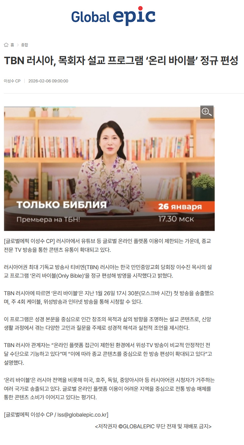 TBN ·¯½Ã¾Æ, Çѱ¹ ¸ñȸÀÚ ¼³±³ ¹æ¼Û '¿Â¸® ¹ÙÀ̺í' ¹æ¿µ