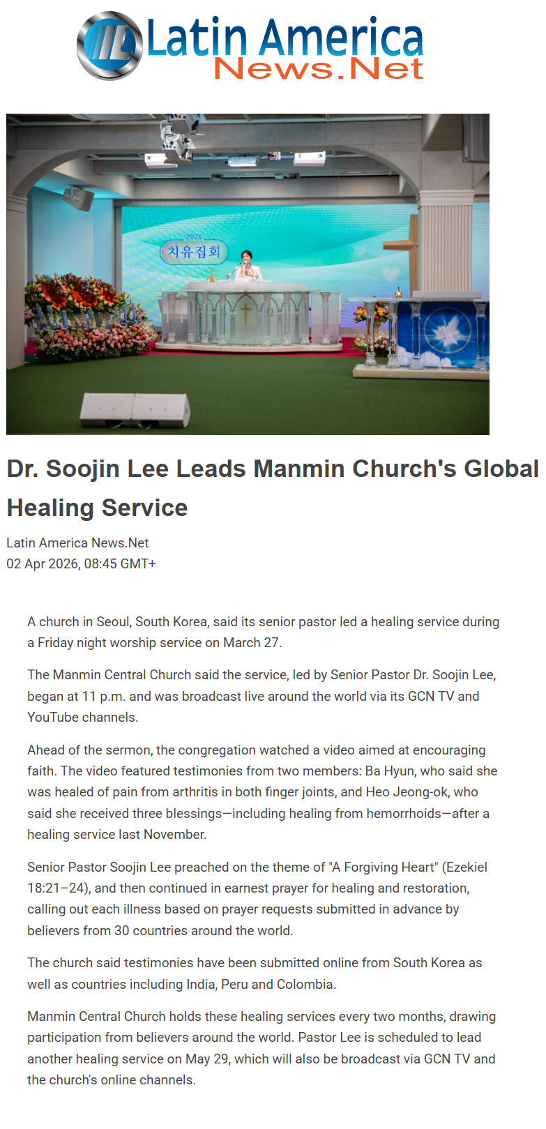 A church in Seoul, South Korea, said its senior pastor led a healing service during a Friday night worship service on March 27. The Manmin Central Church said the service, led by Senior Pastor Dr. Soojin Lee, began at 11 p.m. and was broadcast li ...